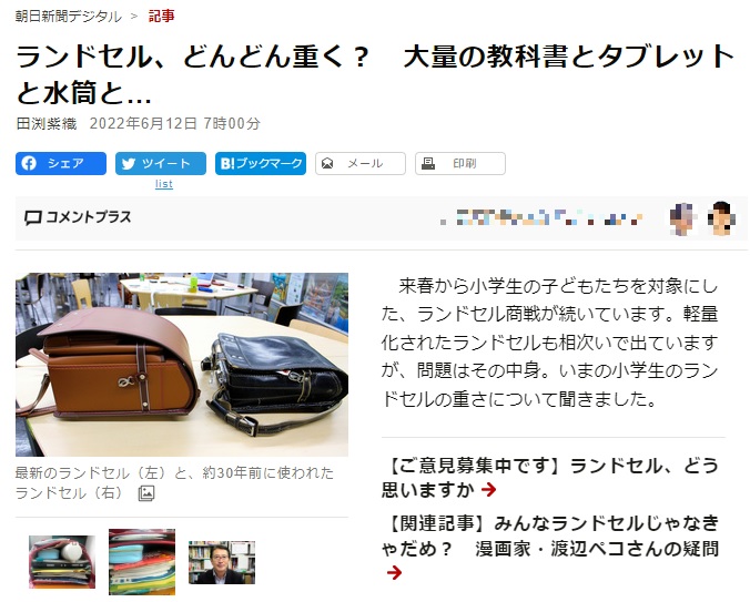 西日本新聞:ランドセル 時代とともに 学習内容増で大型化
