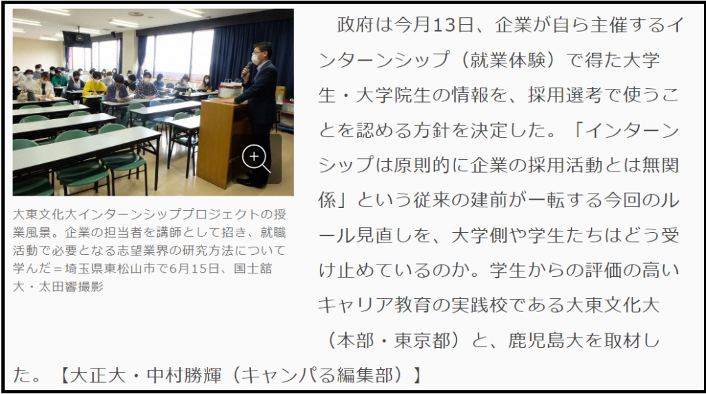 ▽下記より記事が開けます(「青田買い」容認に波紋 企業の採用でインターン情報活用OKに| 毎日新聞 (mainichi.jp))