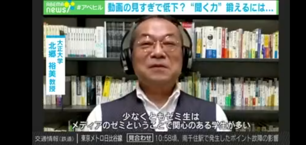 北郷裕美教授(公共政策学科)が、6月27日(月)12:00~放送のABEMAヒルズに出演しました。番組内では、「若者の”聴く力”がおちている」という指摘について取り上げており、ラジオなどの音声情報の重要性について北郷裕美教授が専門家としてコメントしました。