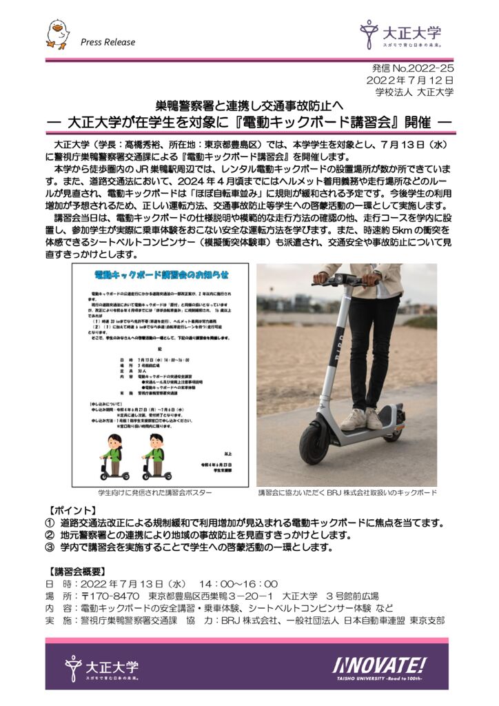 【プレスリリース】巣鴨警察署と連携し交通事故防止へ ― 大正大学が在学生を対象に『電動キックボード講習会』開催 ―