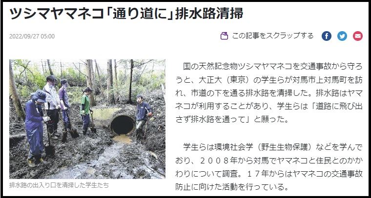 公共政策学科の学生有志4名と引率教員の高橋正弘教授・本田裕子教授が、長崎県対馬市でツシマヤマネコ交通事故防止の保護活動として、市道の下を通る排水路清掃を行った様子が読売新聞に掲載されました。