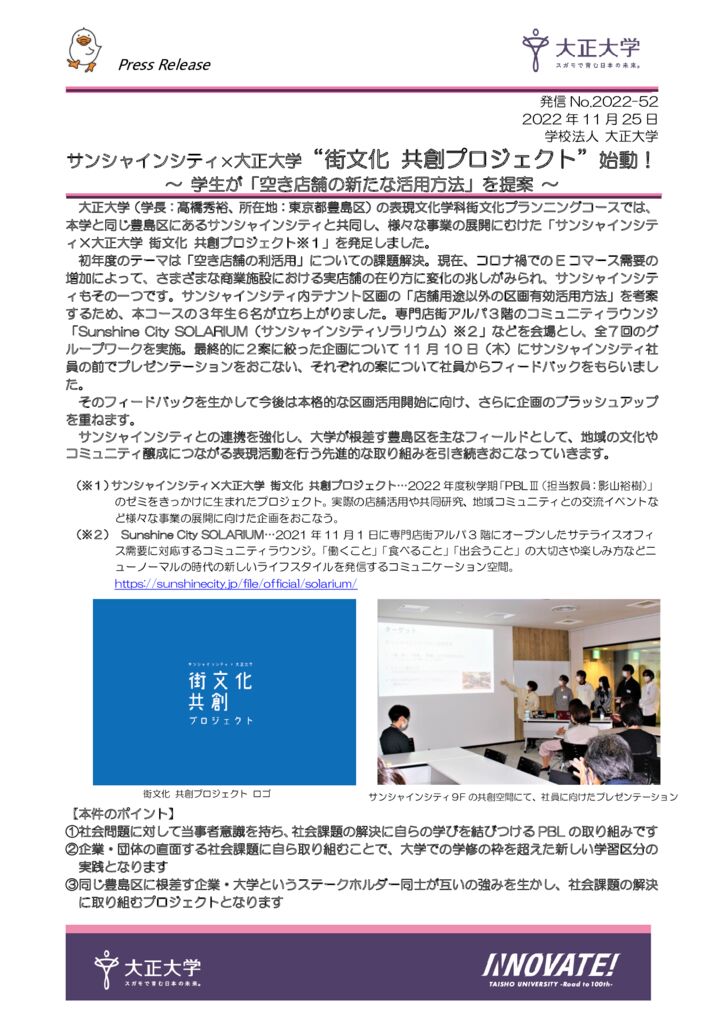 【プレスリリース】サンシャインシティ×大正大学“街文化 共創プロジェクト”始動! ~ 学生が「空き店舗の新たな活用方法」を提案 ~