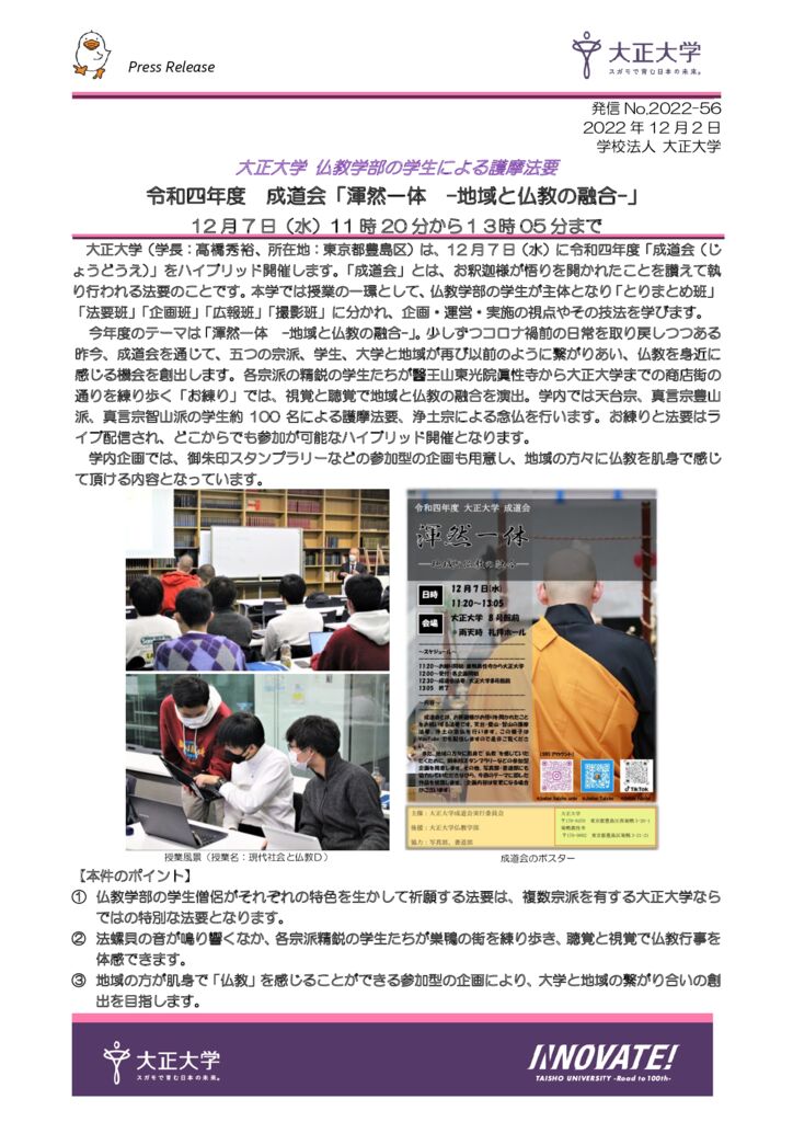 【プレスリリース】大正大学 仏教学部の学生による護摩法要 令和四年度 成道会「渾然一体 –地域と仏教の融合-」 12月7日(水)11時20分から13時05分まで