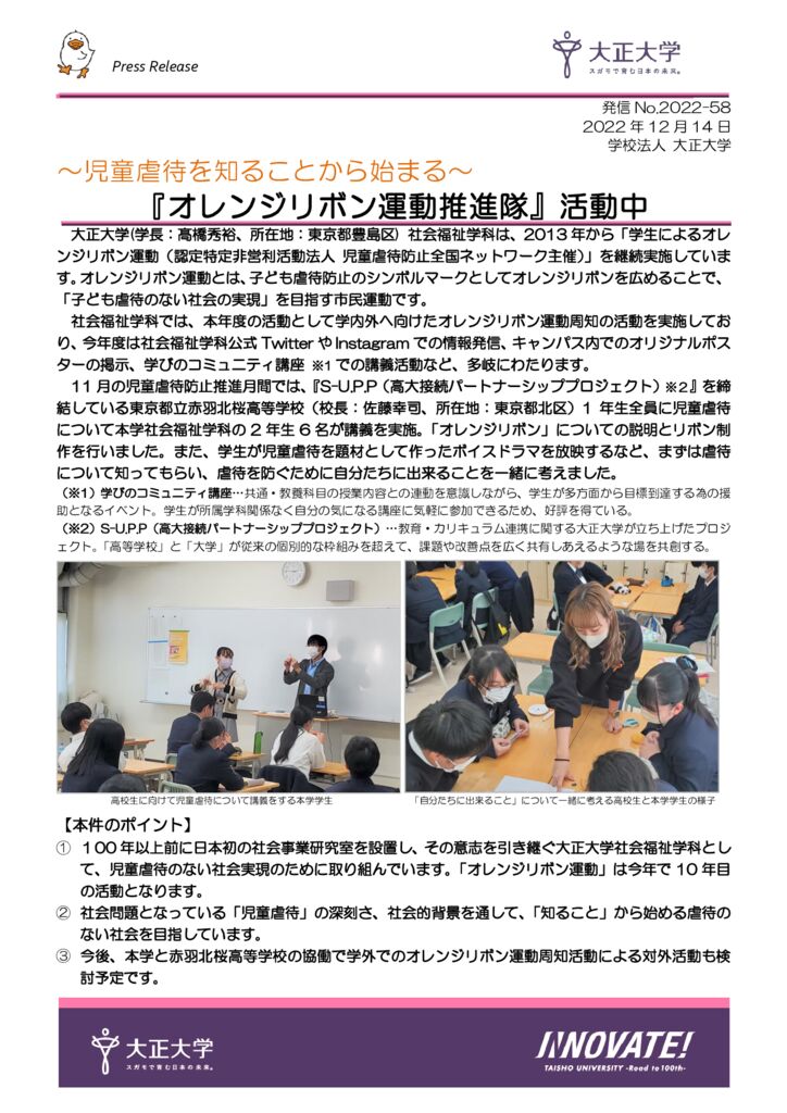 大正大学社会福祉学科は、2013年から「学生によるオレンジリボン運動(認定特定非営利活動法人 児童虐待防止全国ネットワーク主催)」を継続実施しています。オレンジリボン運動とは、子ども虐待防止のシンボルマークとしてオレンジリボンを広めることで、「子ども虐待のない社会の実現」を目指す市民運動です。