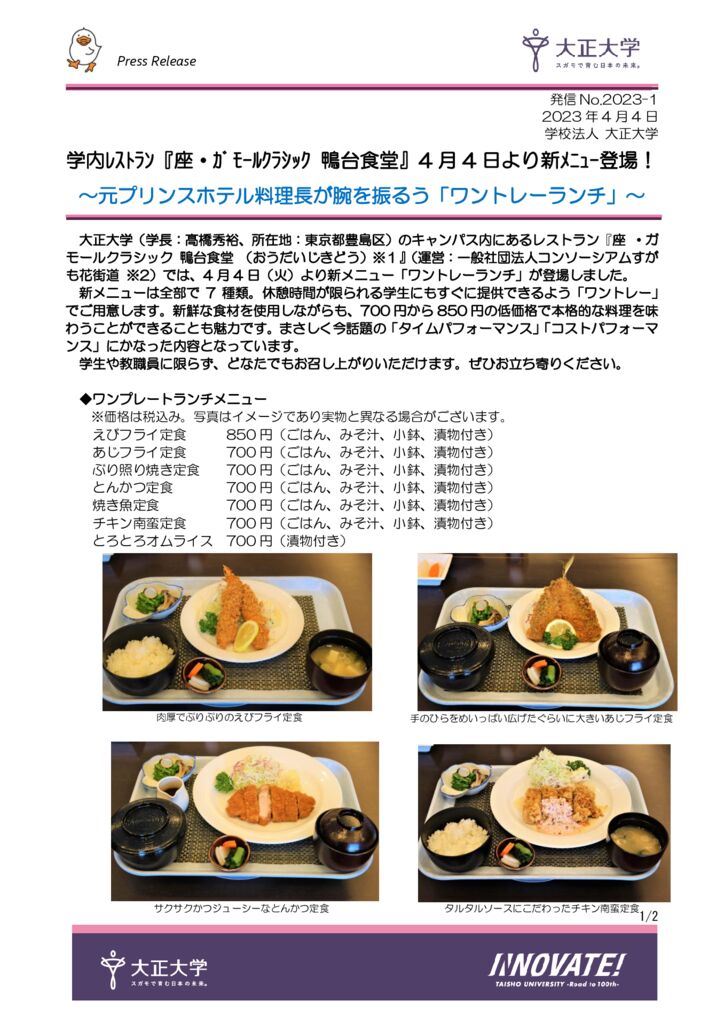 【プレスリリース】学内レストラン『座・ガモールクラシック 鴨台食堂』4月4日より新メニュー登場! ~元プリンスホテル料理長が腕を振るう「ワントレーランチ」~