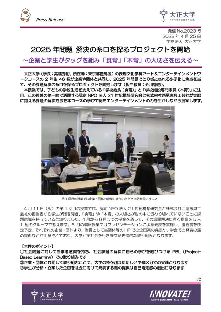 【プレスリリース】2025年問題 解決の糸口を探るプロジェクトを開始 ~企業と学生がタッグを組み「食育」「木育」の大切さを伝える~