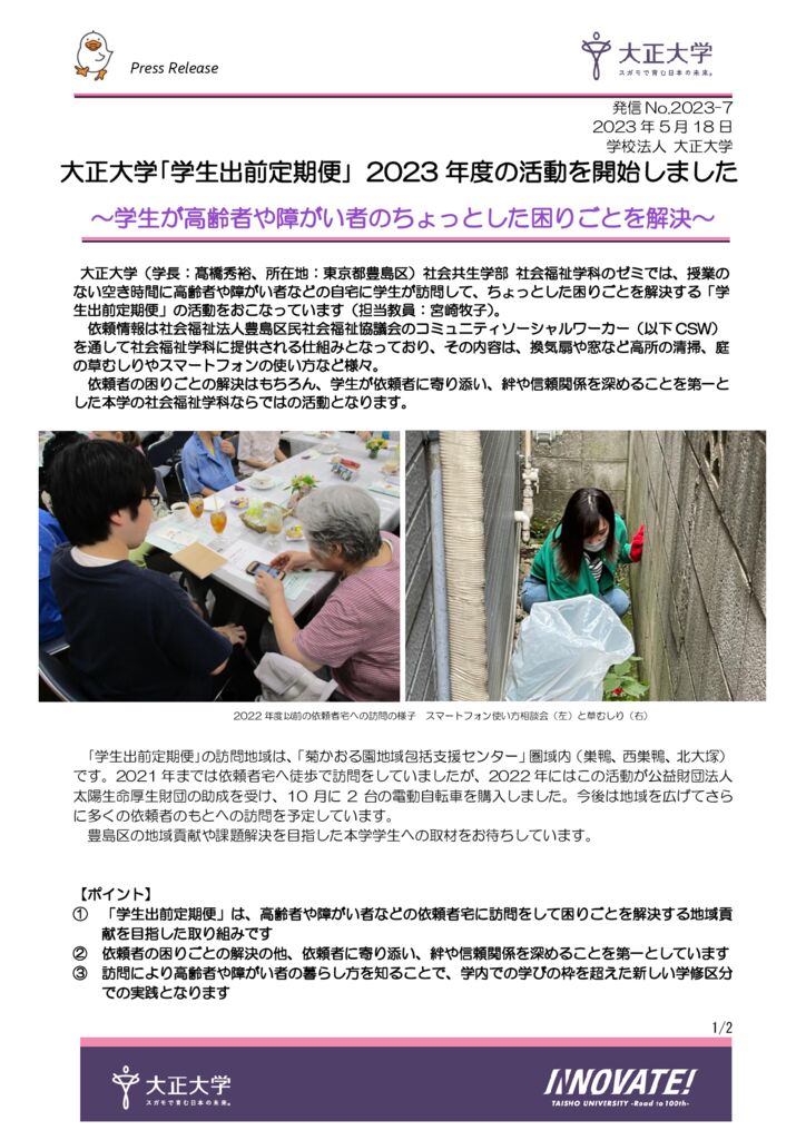 【プレスリリース】大正大学「学生出前定期便」 2023年度の活動を開始しました ~学生が高齢者や障がい者のちょっとした困りごとを解決~
