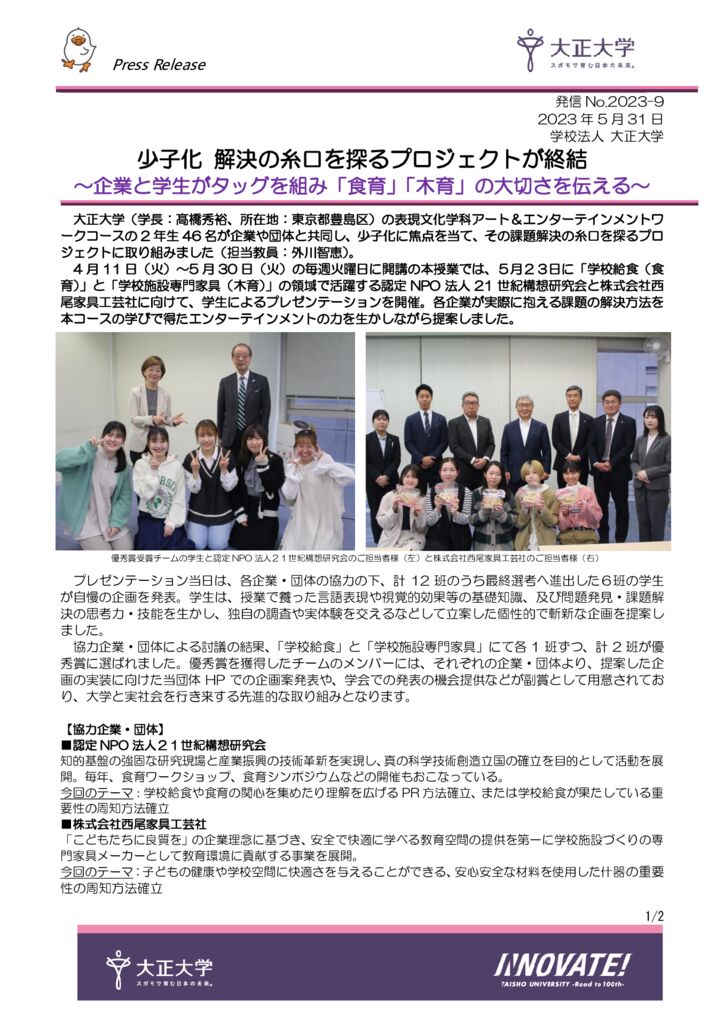 【プレスリリース】少子化 解決の糸口を探るプロジェクトが終結 ~企業と学生がタッグを組み「食育」「木育」の大切さを伝える~