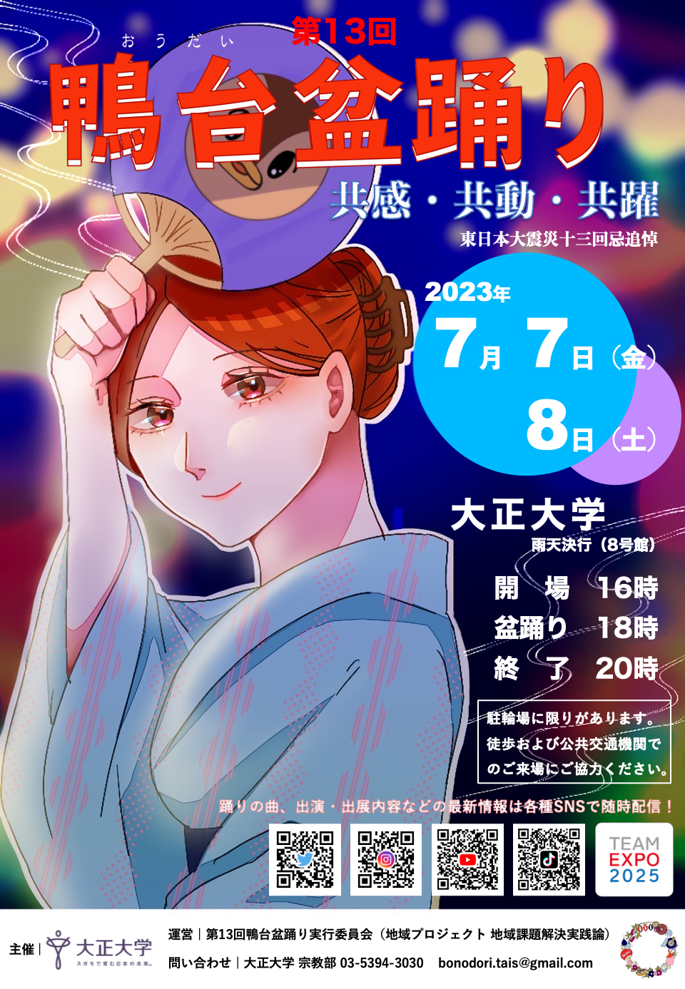 大正大学では、2023年7月7日(金)、8日(土)の2日間、第13回 鴨台盆踊り「共感 共動 共躍」を開催いたします。