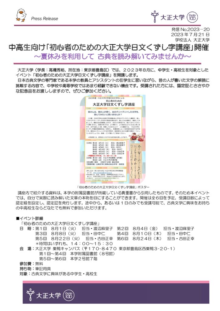 【プレスリリース】中高生向け「初心者のための大正大学日文くずし字講座」開催 ~夏休みを利用して 古典を読み解いてみませんか~
