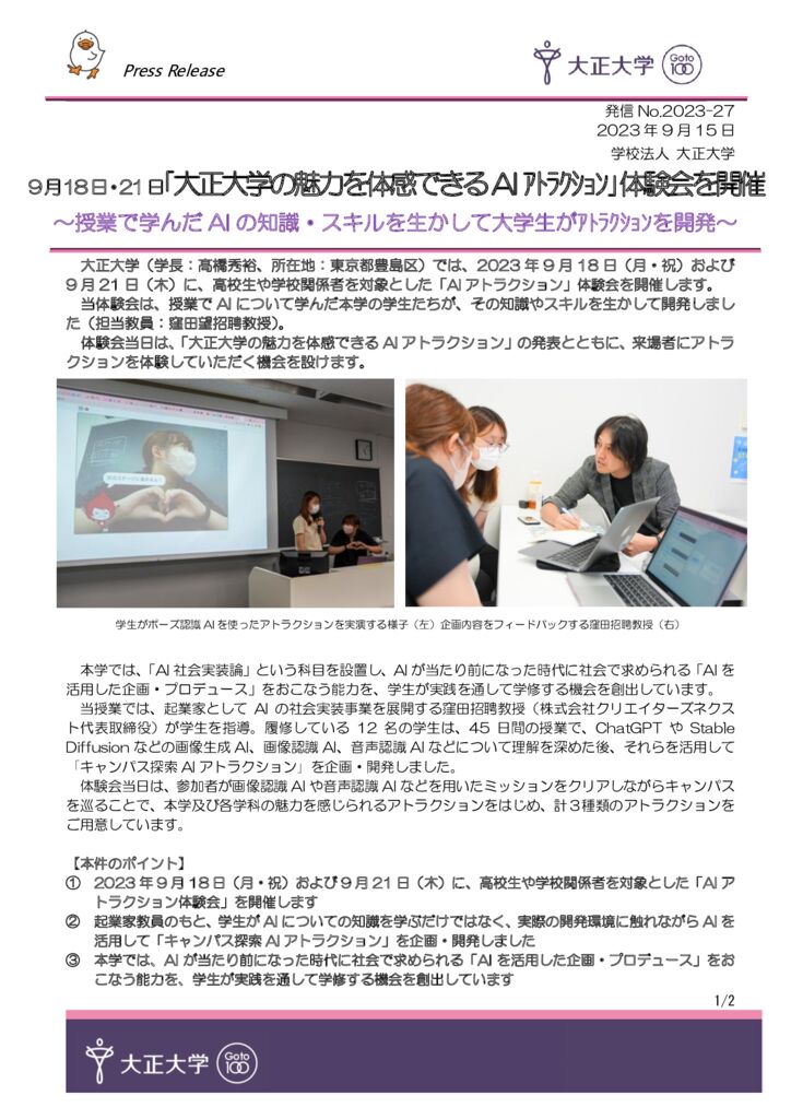 【プレスリリース】9月18日・21日「大正大学の魅力を体感できるAIアトラクション」体験会を開催 ~授業で学んだAIの知識・スキルを生かして大学生がアトラクションを開発~
