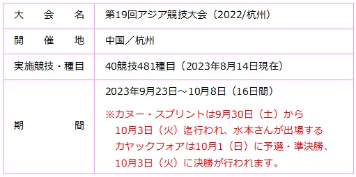 本学卒業生の水本圭治選手(人間科学科2010年度卒)が、第19回アジア競技大会(2022/杭州)に、カヌー・スプリントの選手として出場します。
