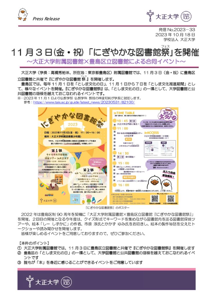 【プレスリリース】11月3日(金・祝)「にぎやかな図書館祭(フェス)」を開催 ~大正大学附属図書館×豊島区立図書館による合同イベント~