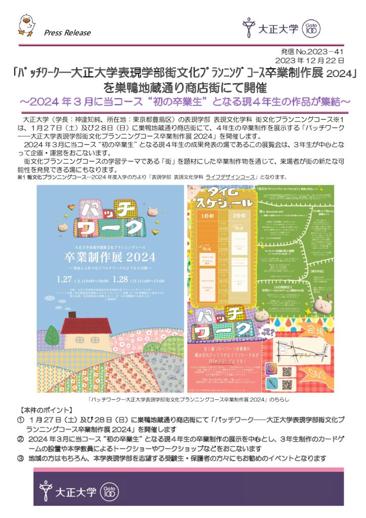 【プレスリリース】「パッチワーク―大正大学表現学部街文化プランニングコース卒業制作展2024」を巣鴨地蔵通り商店街にて開催 ~2024年3月に当コース“初の卒業生”となる現4年生の作品が集結~