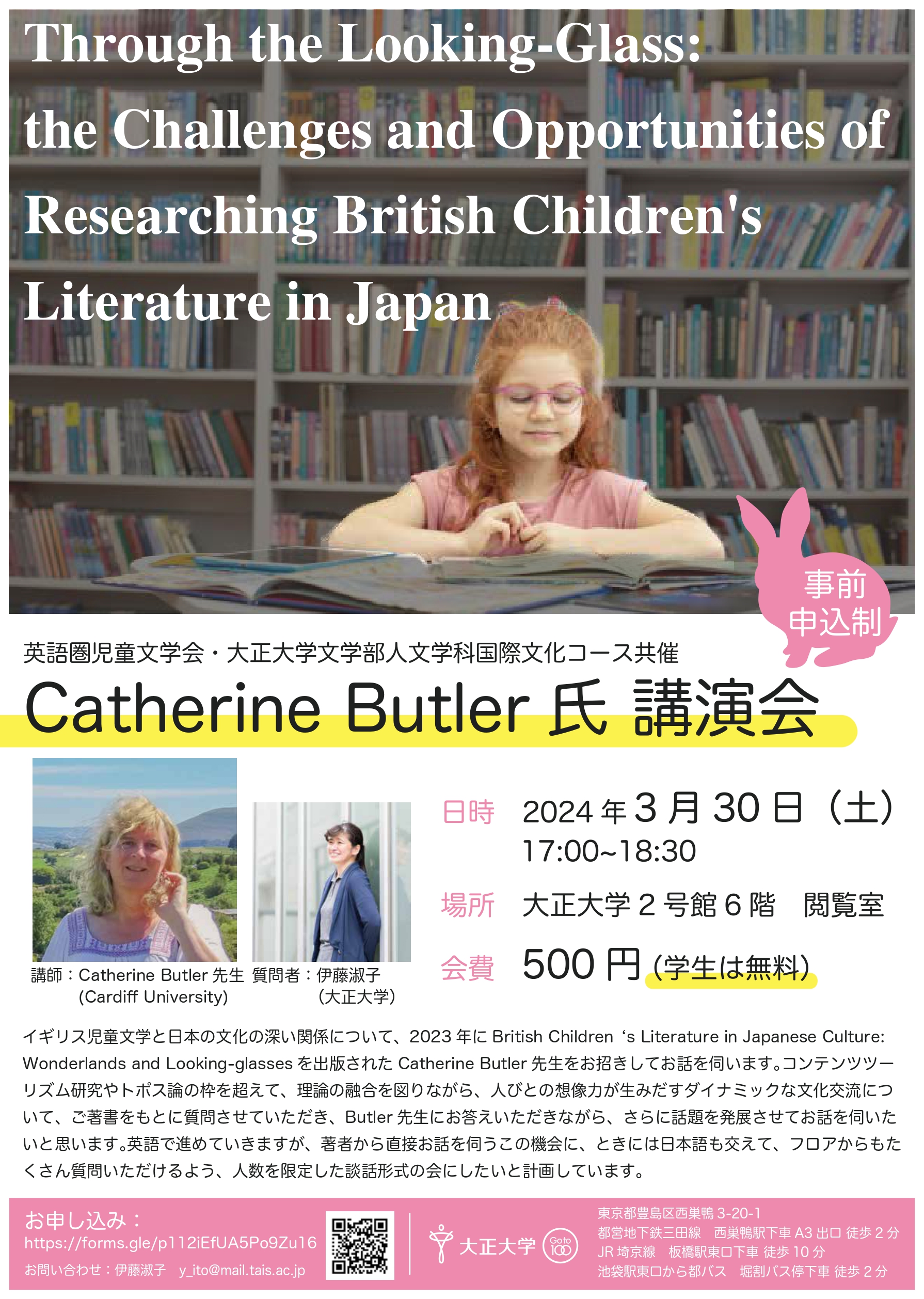 本学の文学部人文学科国際文化コースが英語圏児童文学会と共催で、「Catherine Butler 氏の講演会」を開催します。