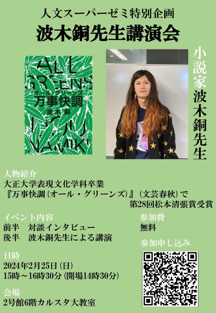 本学の文学部人文学科では、特別企画として、2024年2月25日(日)に小説家の波木銅(なみき・どう)氏を招いた講演会を開催します。波木氏は本学表現学部表現文化学科の卒業生で、在学中に第 28 回松本清張賞を受賞しました。