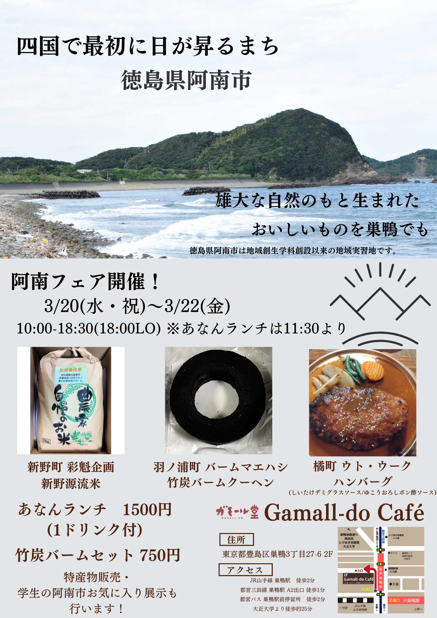 3月16日(土)にリニューアルオープンした、本学の地域創生学科の学生が運営するSDGs社会貢献型店舗『ガモール堂』で、阿南フェアを開催します。