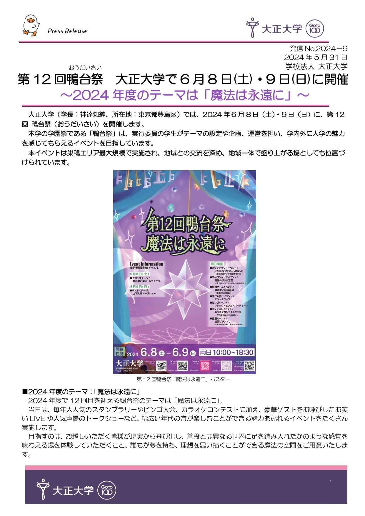 【プレスリリース】第12回鴨台祭 大正大学で6月8日(土)・9日(日)に開催 ~2024年度のテーマは「魔法は永遠に」~