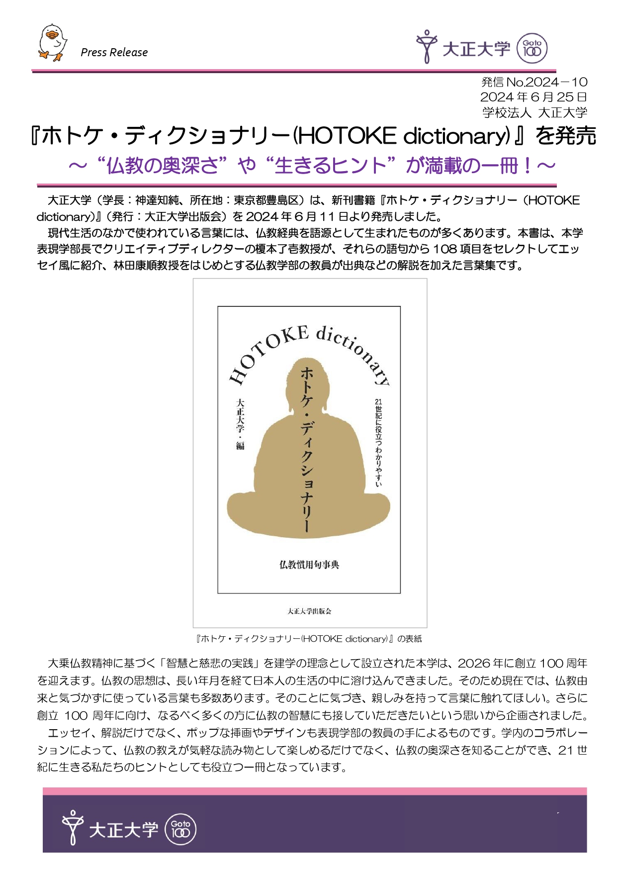 現代生活のなかで使われている言葉には、仏教経典を語源として生まれたものが多くあります。本書は、本学表現学部長でクリエイティブディレクターの榎本了壱教授が、それらの語句から108項目をセレクトしてエッセイ風に紹介、林田康順教授をはじめとする仏教学部の教員が出典などの解説を加えた言葉集です。