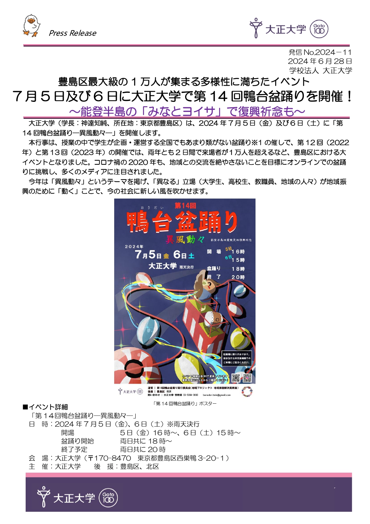 本行事は、授業の中で学生が企画・運営する全国でもあまり類がない盆踊りの催しで、第12回(2022年)と第13回(2023年)の開催では、両年とも2日間で来場者が1万人を超えるなど、豊島区における大イベントとなりました。コロナ禍の2020年も、地域との交流を絶やさないことを目標にオンラインでの盆踊りに挑戦し、多くのメディアに注目されました。 今年は「異風動々」というテーマを掲げ、「異なる」立場(大学生、高校生、教職員、地域の人々)が地域振興のために「動く」ことで、今の社会に新しい風を吹かせます。