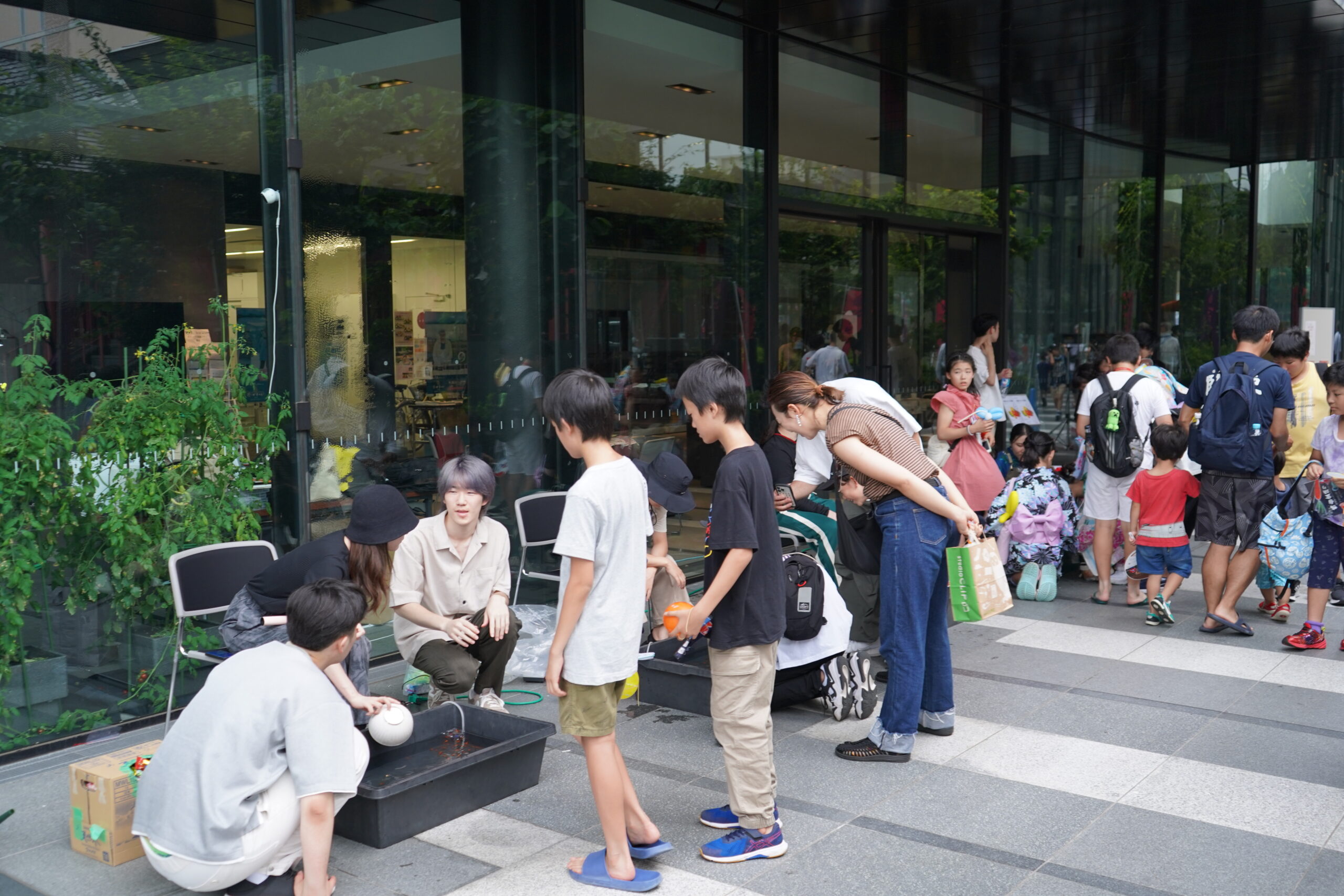 学生団体が企画・運営する屋台には、金魚すくいや輪投げ、手作りバスボムワークショップなどがあり、子どもたちがたくさん集まっていました。学生が子どもたちに金魚すくいのコツを伝えたり、うまく金魚がすくえたら一緒に喜んだりと、貴重な交流の機会となりました。