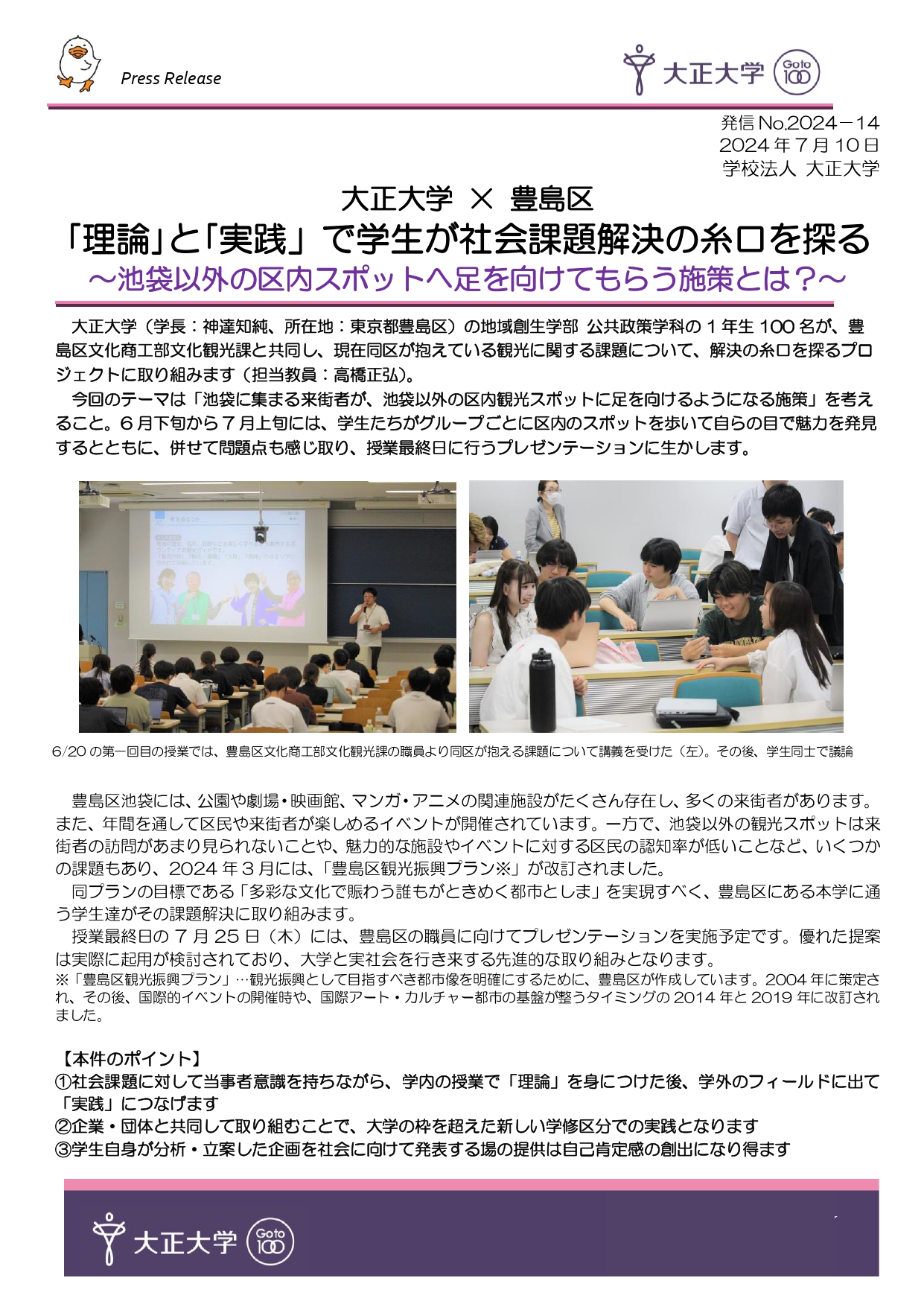 【プレスリリース】大正大学 × 豊島区 「理論」と「実践」で学生が社会課題解決の糸口を探る ~池袋以外の区内スポットへ足を向けてもらう施策とは?~
