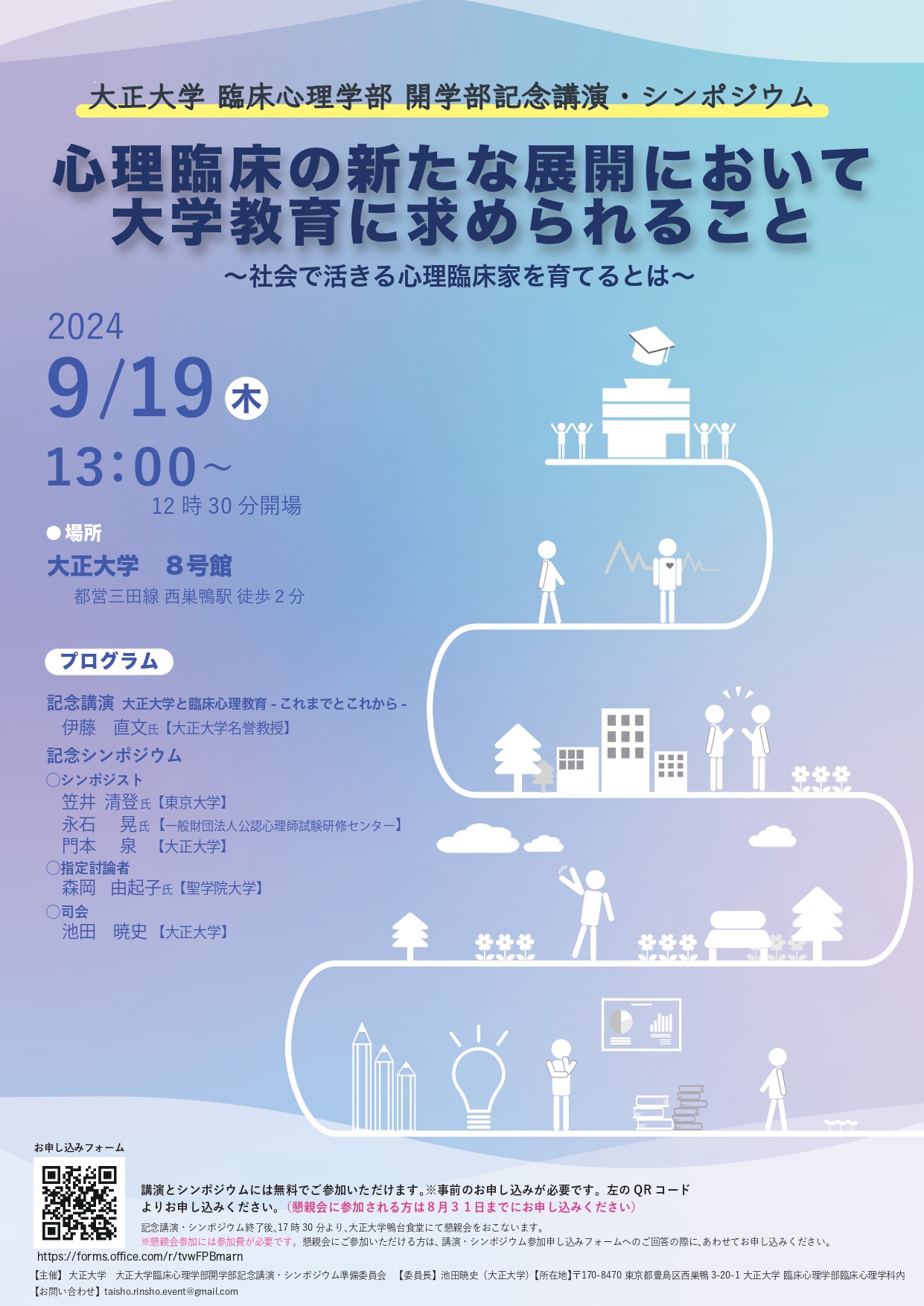 9月19日(木)13:00から「大正大学 臨床心理学部 開学部記念講演・シンポジウム『心理臨床の新たな展開において大学教育に求められること~社会で活きる心理臨床家を育てるとは~』」を本学8号館にて開催します。