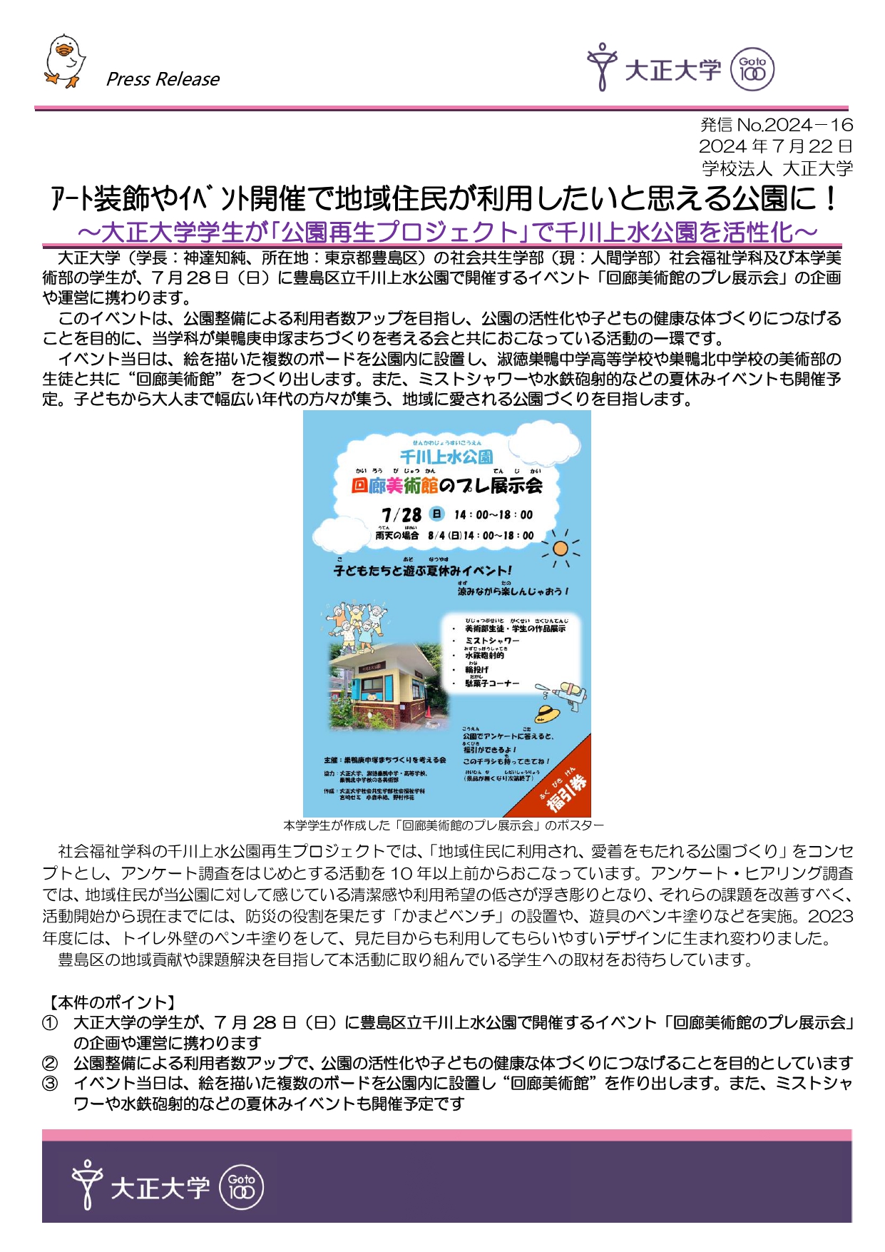 【プレスリリース】アート装飾やイベント開催で地域住民が利用したいと思える公園に! ~大正大学学生が「公園再生プロジェクト」で千川上水公園を活性化~