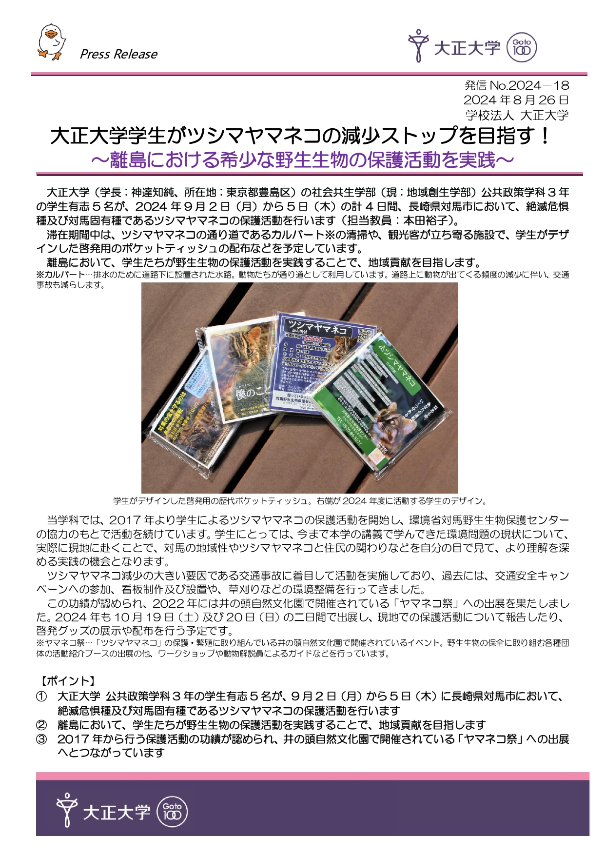 【プレスリリース】大正大学学生がツシマヤマネコの減少ストップを目指す! ~離島における希少な野生生物の保護活動を実践~