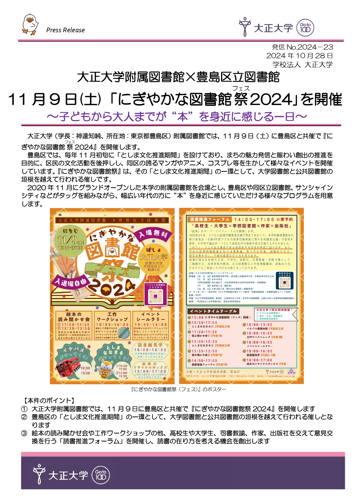 【プレスリリース】大正大学附属図書館×豊島区立図書館 11月9日(土)「にぎやかな図書館祭(フェス)2024」を開催 ~子どもから大人までが“本”を身近に感じる一日~