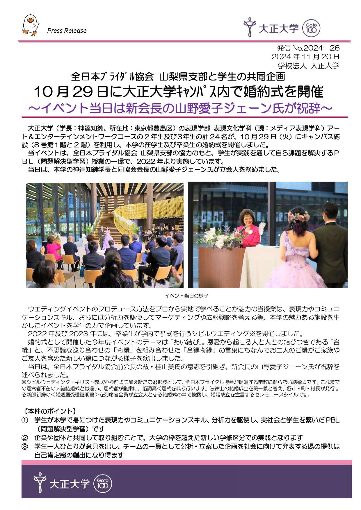 【プレスリリース】全日本ブライダル協会 山梨県支部と学生の共同企画 10月29日に大正大学キャンパス内で婚約式を開催 ~イベント当日は新会長の山野愛子ジェーン氏が祝辞~