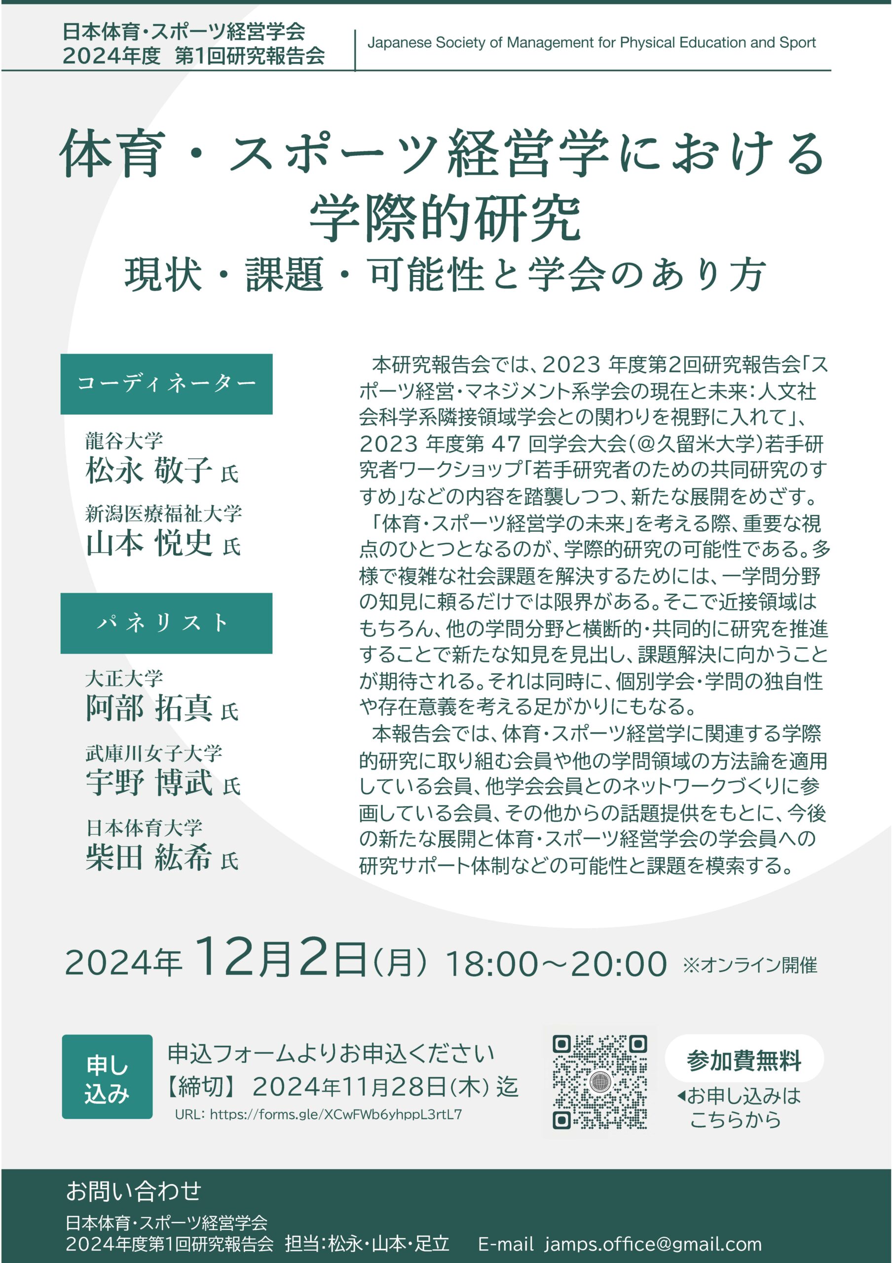 12月2日(月)に阿部拓真助教(公共政策学科)がオンラインで開催される日本体育・スポーツ経営学会主催「2024年度 第1回研究報告会『体育・スポーツ経営学における学際的研究』~現状・課題・可能性と学会のあり方~」にパネリストとして登壇します。