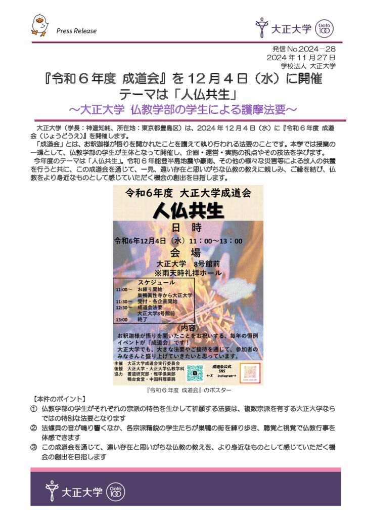 【プレスリリース】『令和6年度 成道会』を12月4日(水)に開催 テーマは「人仏共生」 ~大正大学 仏教学部の学生による護摩法要~