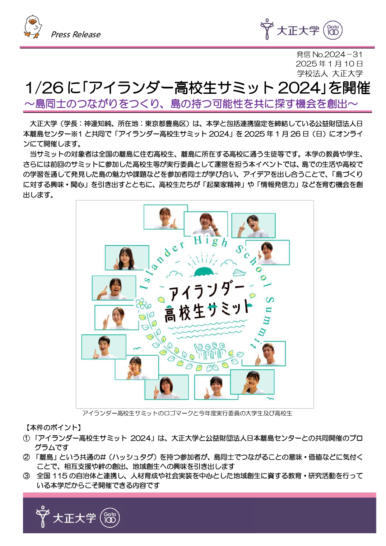 大正大学は、本学と包括連携協定を締結している公益財団法人日本離島センター※1と共同で「アイランダー高校生サミット2024」を2025年1月26日(日)にオンラインにて開催します。