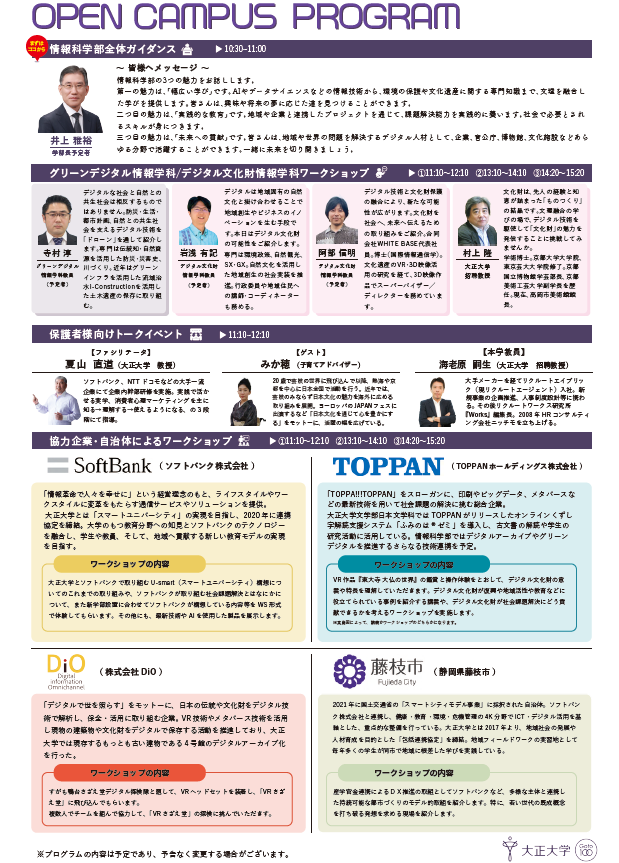 このイベントは2026年4月に設置を構想している情報科学部(仮称)に関連したイベントです。情報科学部についてのガイダンスをはじめ、自治体・企業の特設ブースや生成AIを活用したワークショップなど、様々なコンテンツをお楽しみいただけます。