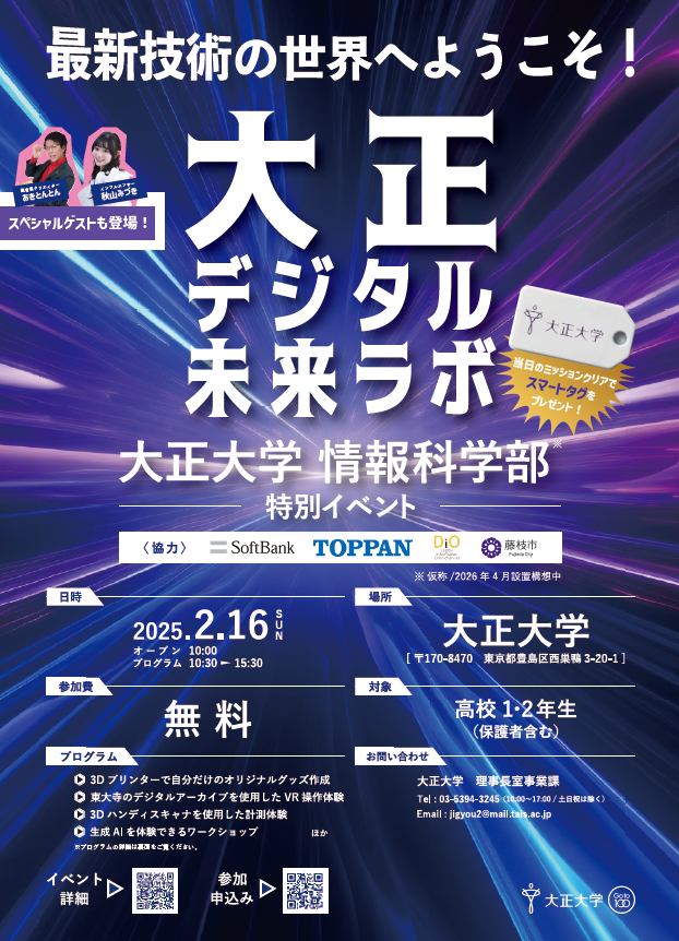 VRや生成AIなどの最新テクノロジーを体感できる受験生向け特別イベント『大正デジタル未来ラボ』を、2月16日(日)に開催します。
