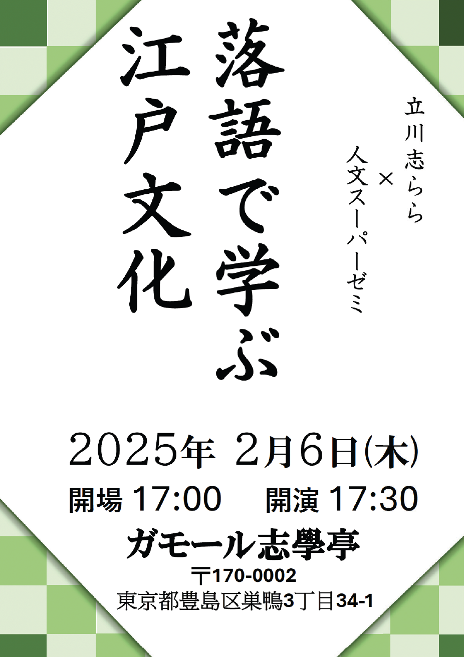 昨年10月に開催し、ご好評いただいた立川志らら×人文スーパーゼミ特別企画「落語で学ぶ江戸文化」が、2月6日(木)17:30からガモール志学亭でアンコール開催されます。