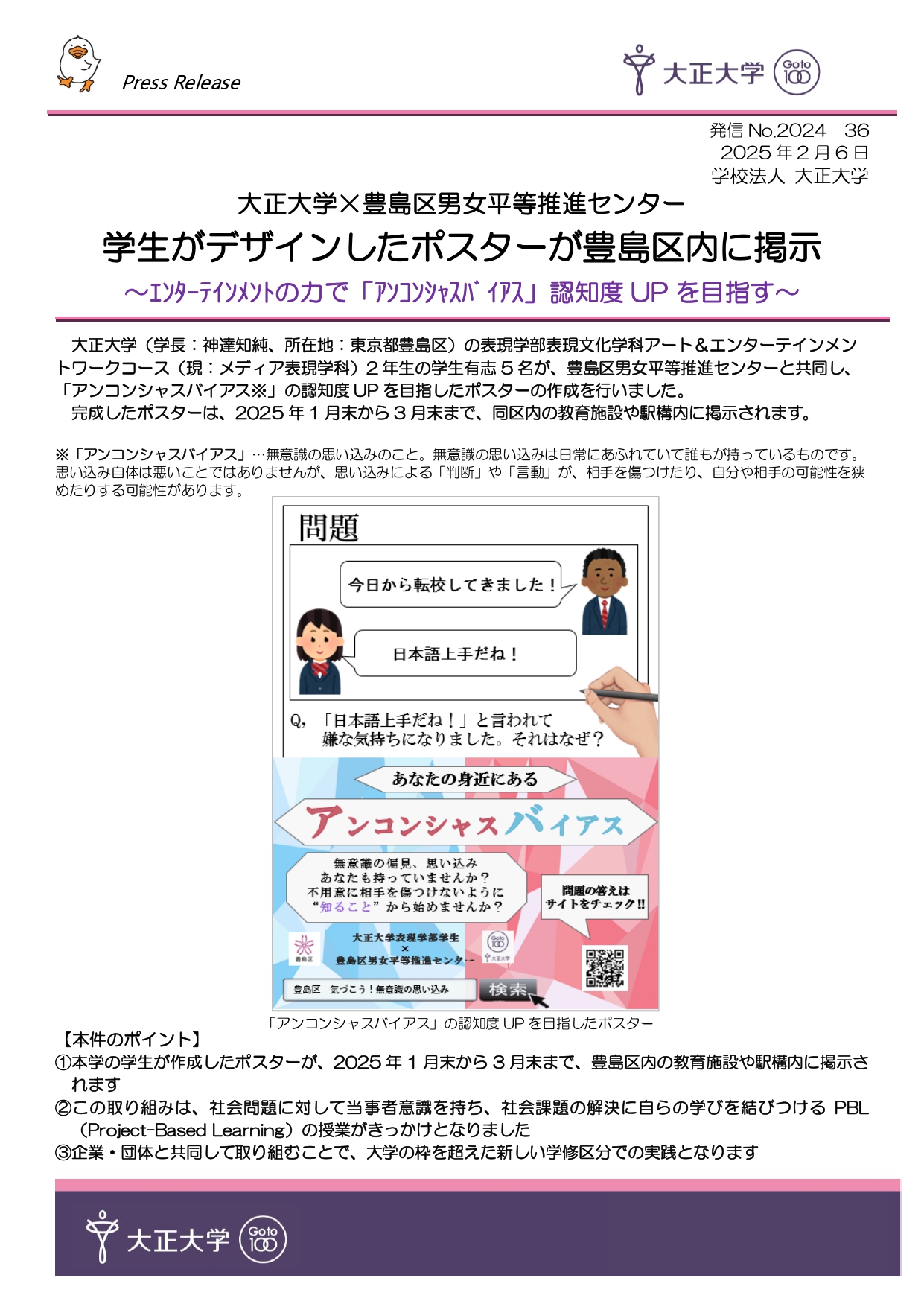 【プレスリリース】大正大学×豊島区男女平等推進センター 学生がデザインしたポスターが豊島区内に掲示 ~エンターテインメントの力で「アンコンシャスバイアス」認知度UPを目指す~