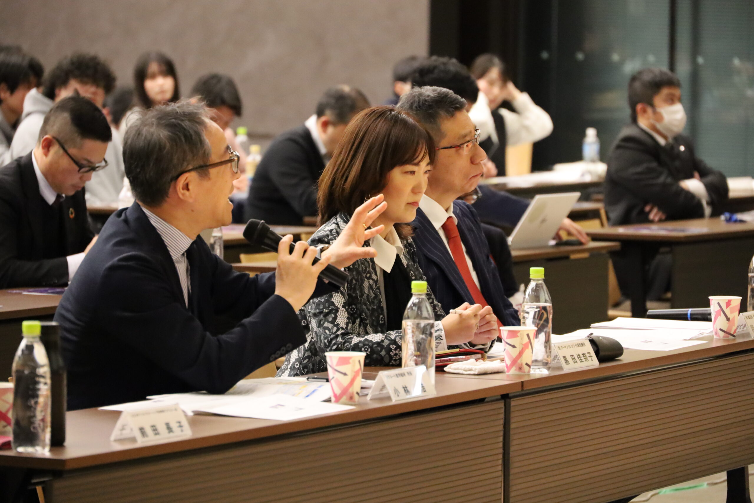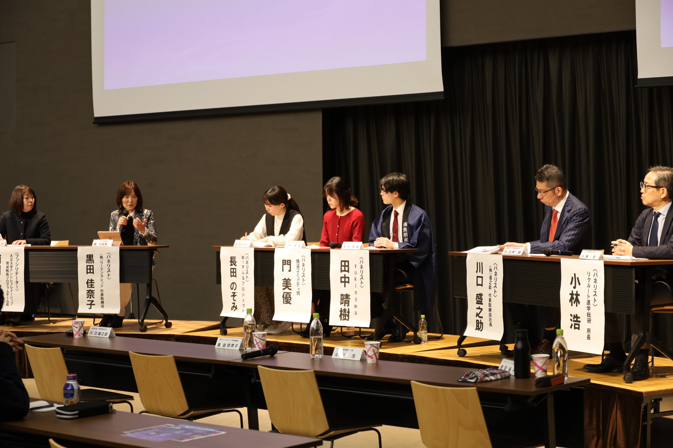 ファシリテーターを前田教授が務め、パネリストに審査員を務めた川口氏・黒田氏・小林氏、ピッチコンテスト「ファイナリスト」の代表として田中さん・門さん・長田さんが登壇しました。