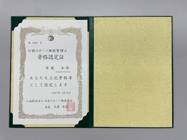 茅島未和さん(臨床心理学科4年)が公益財団法人日本スポーツ施設協会主催の資格認定試験に合格して「公認スポーツ施設管理士」の資格を取得しました。