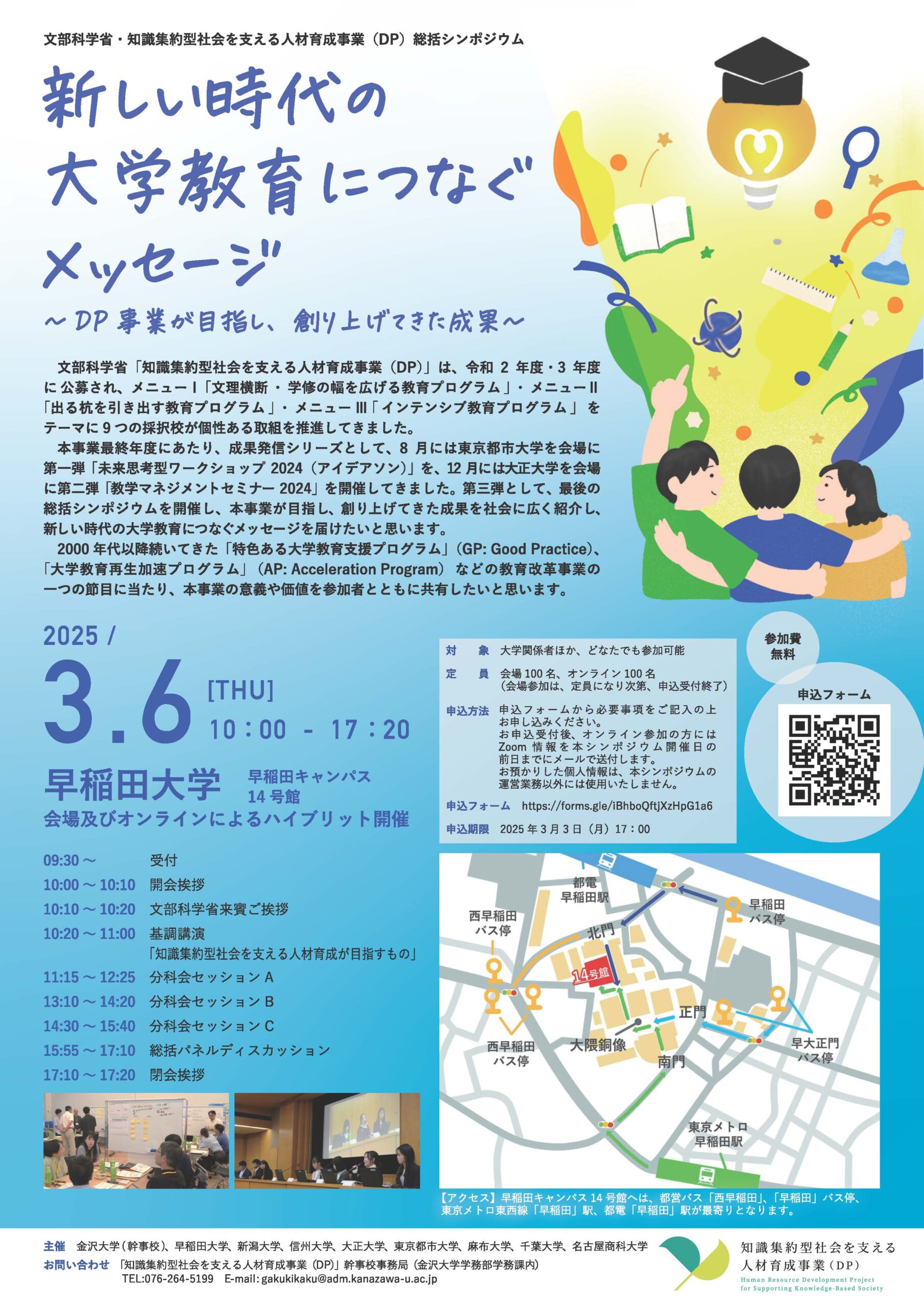 本事業の最終年度にあたり今回は、採択校9大学の合同で「文部科学省・知識集約型社会を支える人材育成事業(DP)総括シンポジウム『新しい時代の大学教育につなぐメッセージ ~DP事業が目指し、創り上げてきた成果~』」を早稲田大学において開催します。