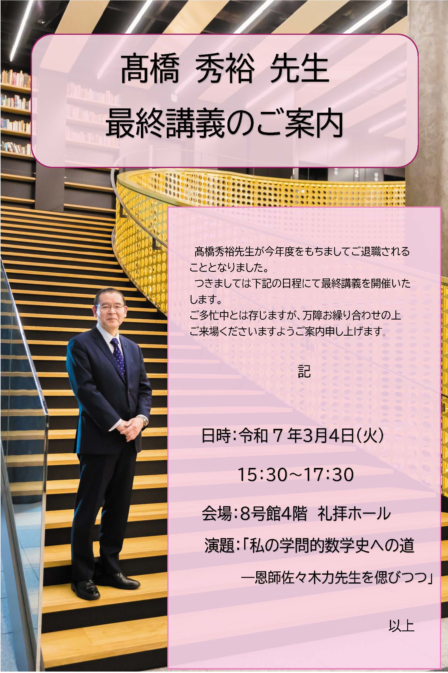 【お知らせ】第36代学長を務めた髙橋秀裕先生が最終講義を行います