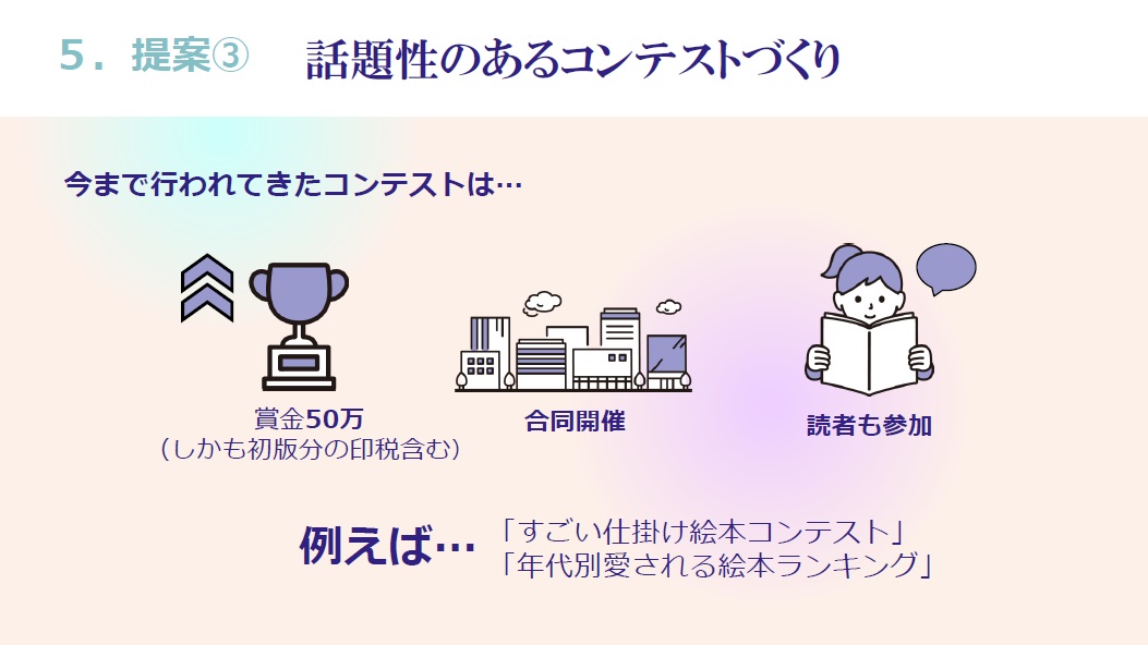 学生は絵本や児童書市場のさらなる発展に加えて、出版業界全体の活性化につなげることを目指して、他にも多くの書店や図書館、作家等の取材協力を得て課題分析を行い、最終的に「貸与権の導入」「話題性のあるコンテスト作り」の2点を提案しました。