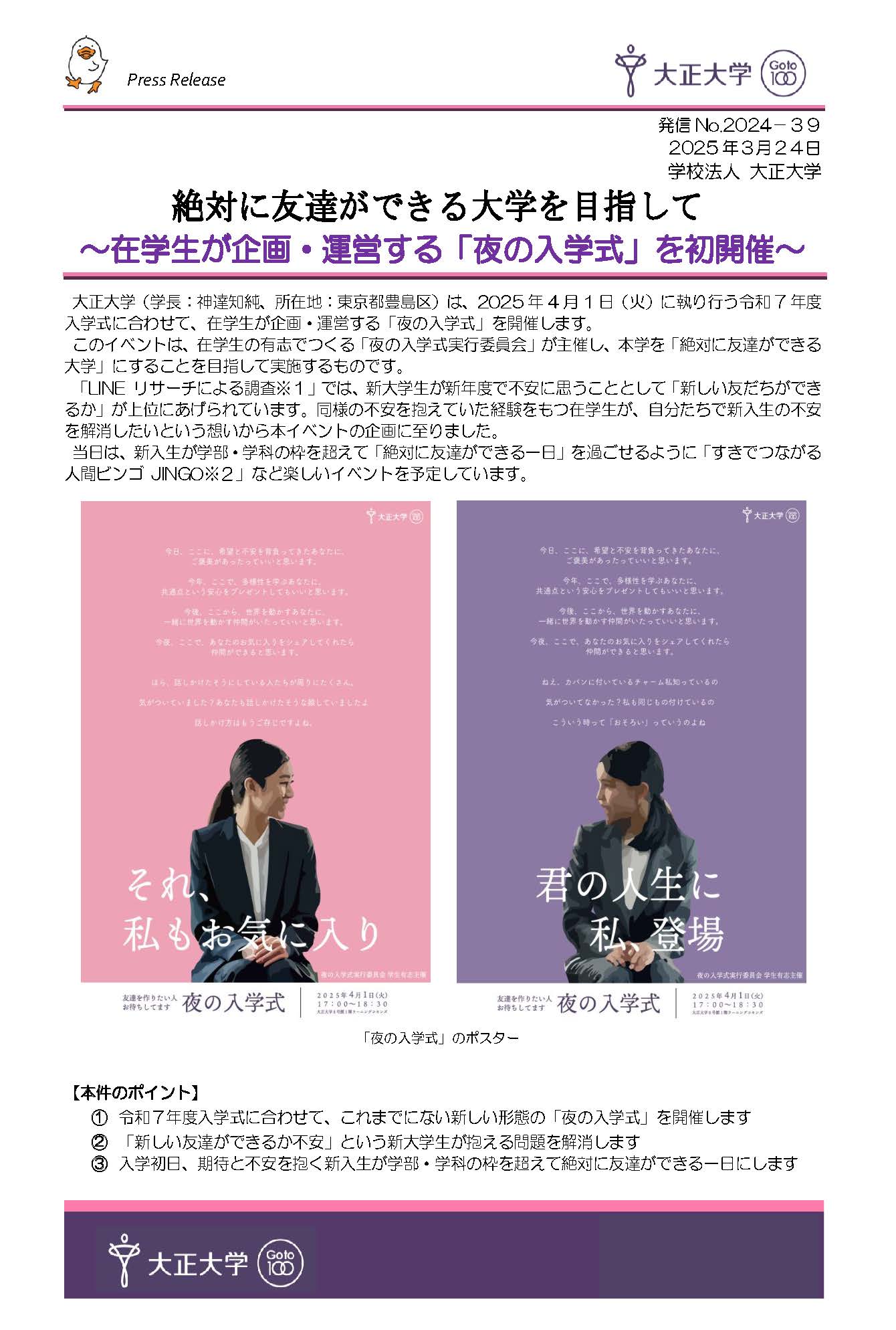 大正大学は、2025年4月1日(火)に執り行う令和7年度入学式に合わせて、在学生が企画・運営する「夜の入学式」を開催します。