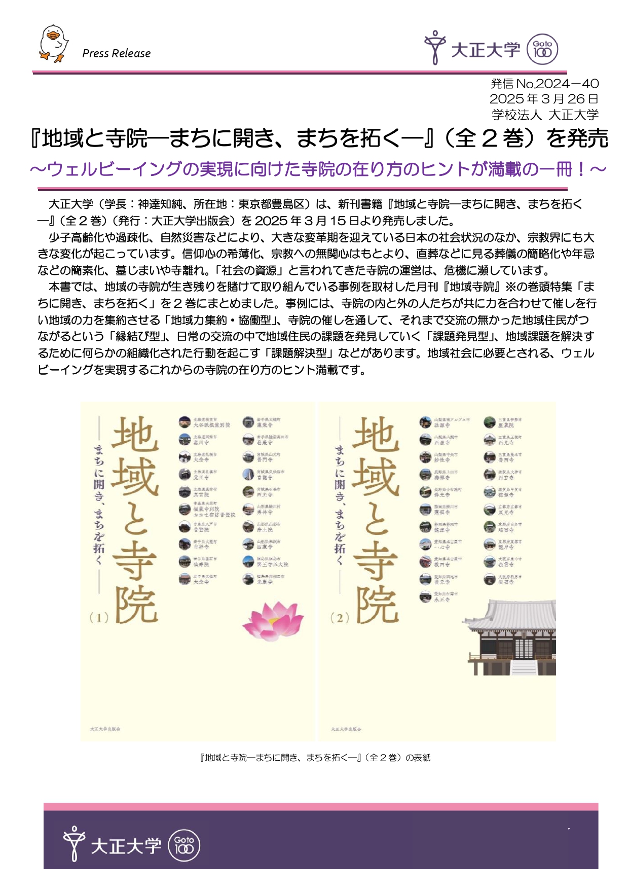 大正大学は、新刊書籍『地域と寺院―まちに開き、まちを拓く―』(全2巻)(発行:大正大学出版会)を2025年3月15日より発売しました。