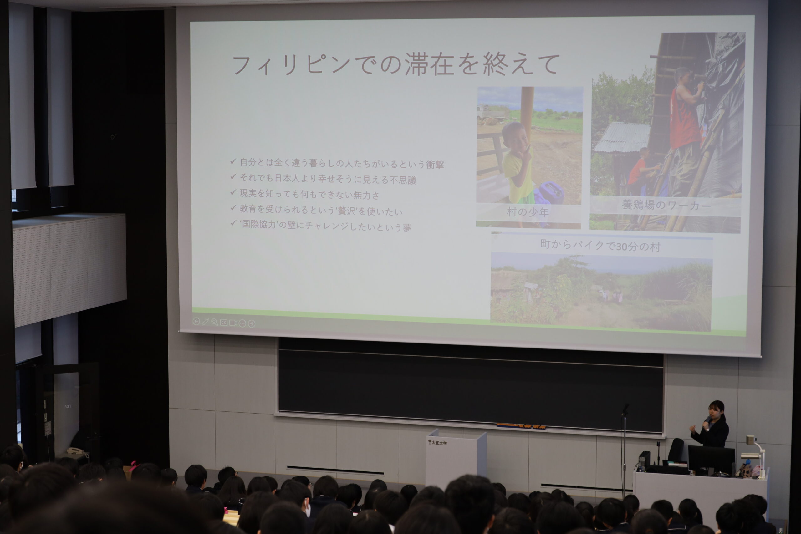 赤野間さんは「フィリピンでの海外インターンシップにおける体験」を中心に発表。ゴミ問題や大気汚染といった、現地が抱える社会課題について紹介するとともに「皆さんが調査に向かうマレーシアにおいても、どのような現実と課題があるのか、よく考えてみてほしい」と投げかけました。