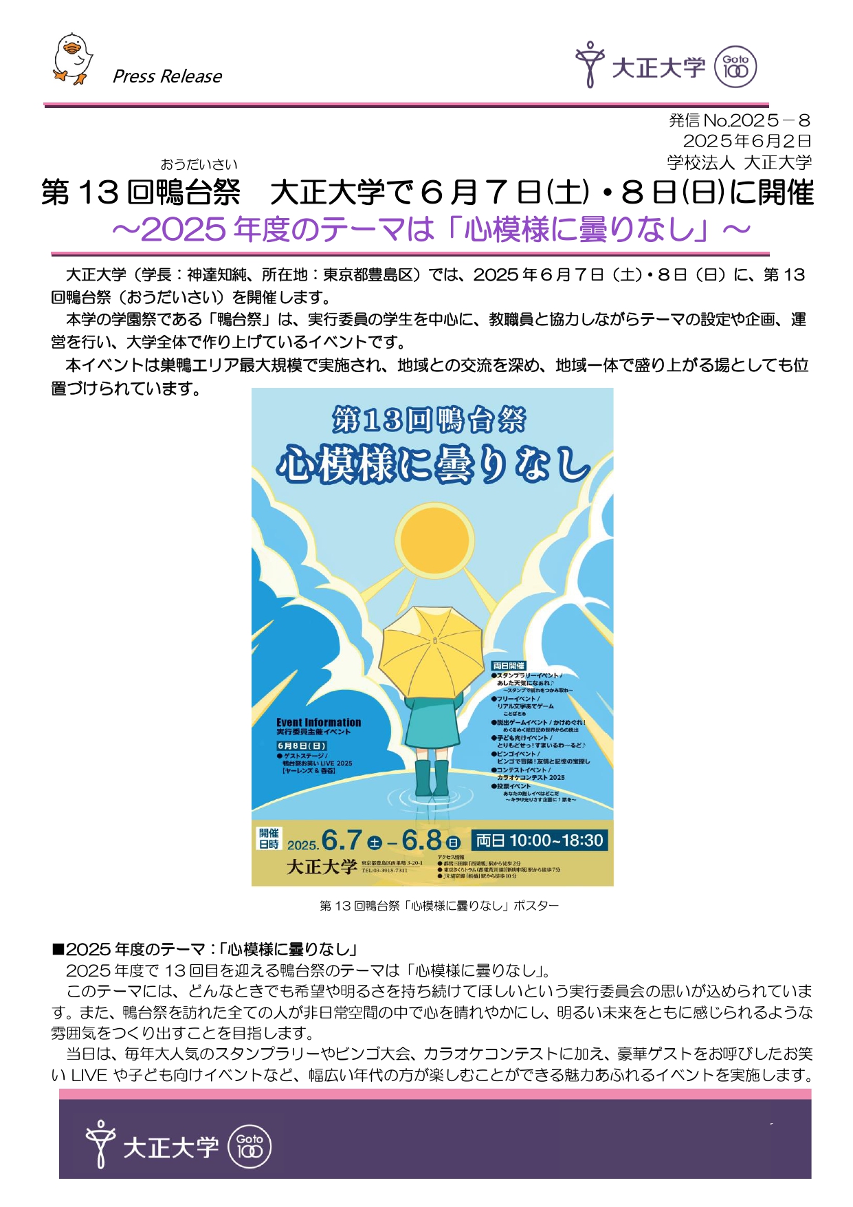 【プレスリリース】第13回鴨台祭 大正大学で6月7日(土)・8日(日)に開催 ~2025年度のテーマは「心模様に曇りなし」~