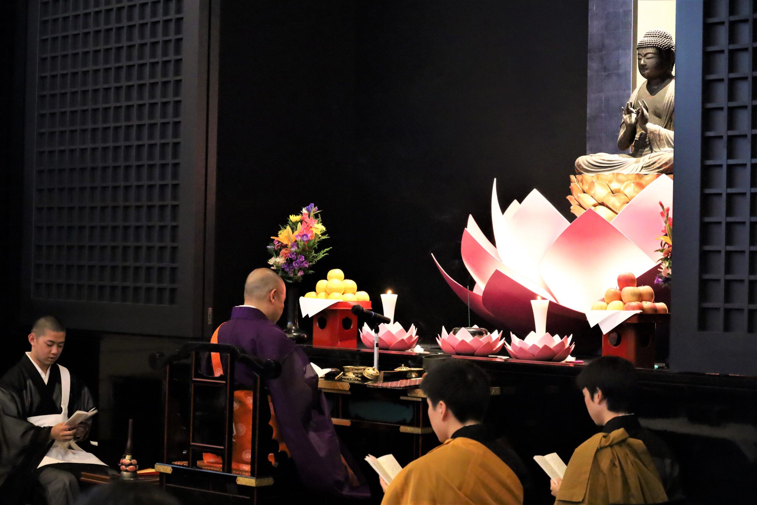 当日は神達知純学長導師のもと、本学設立四宗派(天台宗、真言宗豊山派、真言宗智山派、浄土宗)および時宗の学生が出仕を務め、仏教の開祖であるお釈迦様を偲ぶとともに、本学関係物故者の追悼法要を執り行いました。