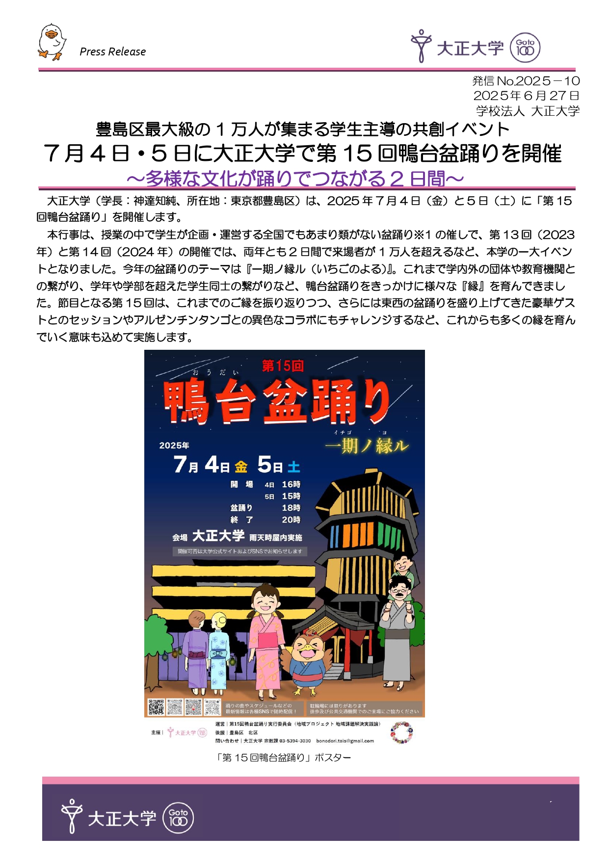 【プレスリリース】豊島区最大級の1万人が集まる学生主導の共創イベント 7月4日・5日に大正大学で第15回鴨台盆踊りを開催 ~多様な文化が踊りでつながる2日間~
