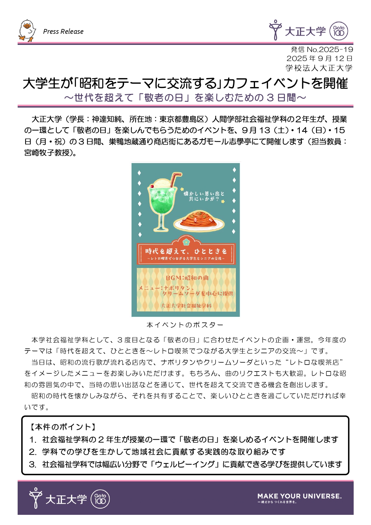 【プレスリリース】大学生が「昭和をテーマに交流する」カフェイベントを開催 ~世代を超えて「敬老の日」を楽しむための3日間~